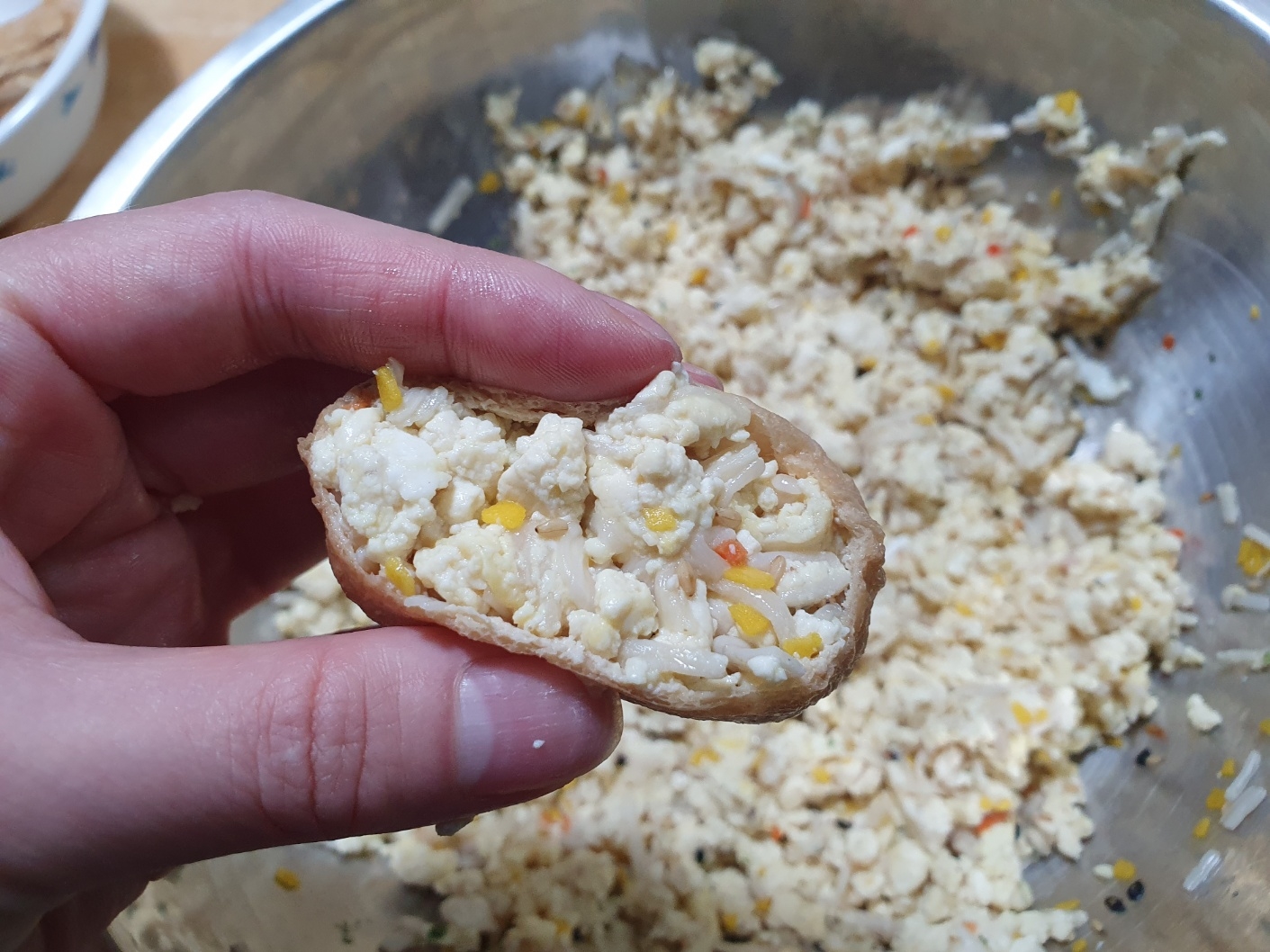 소스를 충분히 제거한 유부에 두부로 속을 꽉꽉 채워주면 끝이랍니다!!