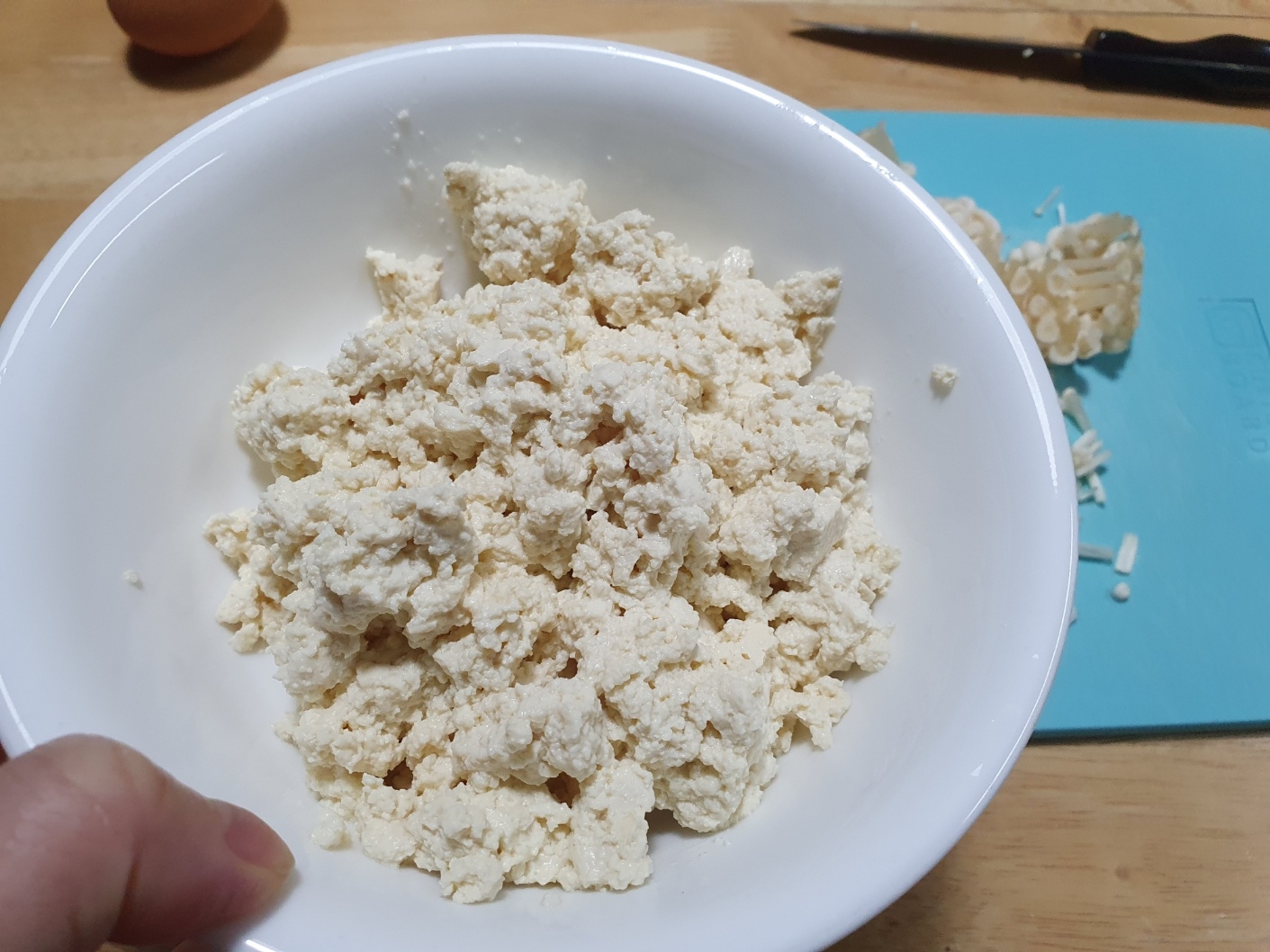 두부를 2분정도 전자레인지에 돌리면, 이정도 간수가 제거가 되는데요~ 후라이팬에 두부 볶아서 사용할 예정이라, 저정도만 간수제거가 적당한 것 같아요!!
