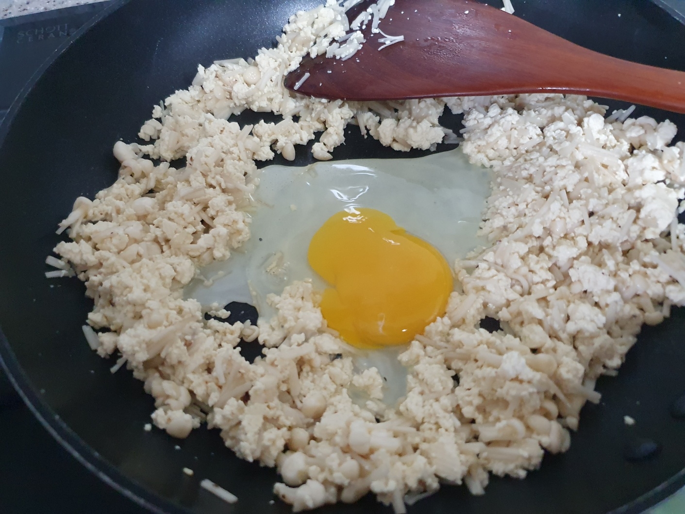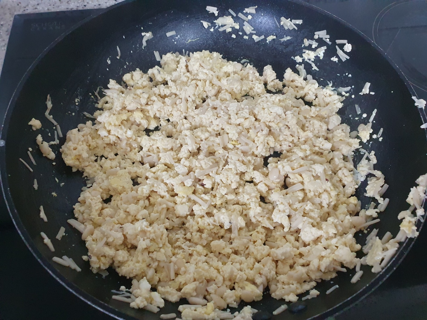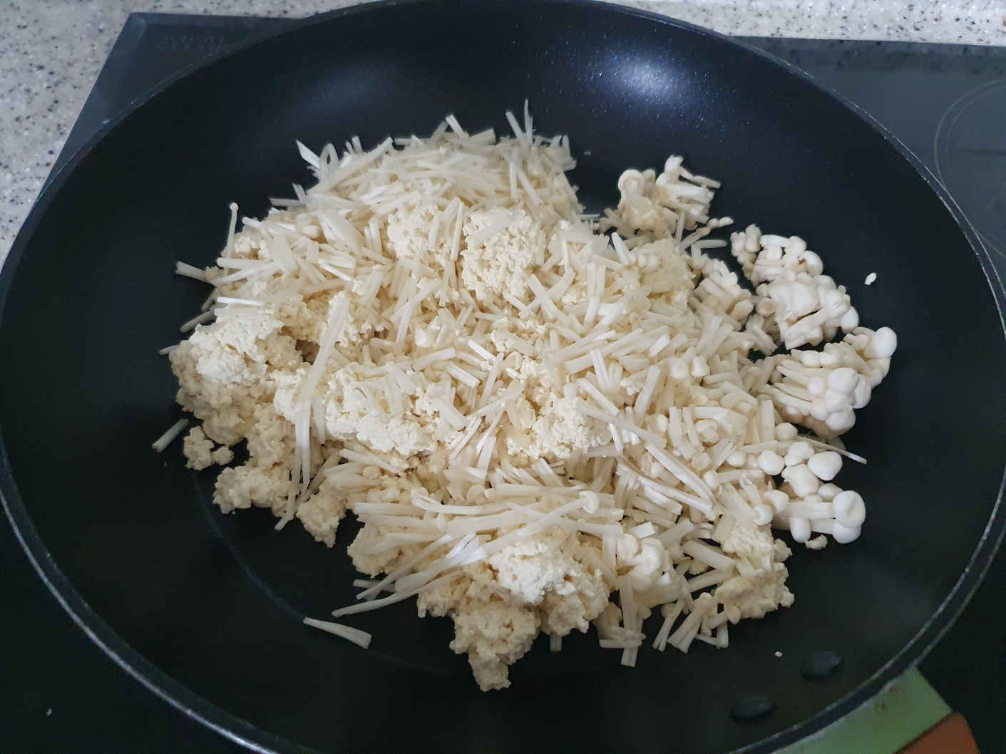 으깬 두부와 팽이버섯을 함께 넣어서 볶아주는데요~~ 이 작업은 물기를 조금 더 제거하고, 팽이버섯을 조리하기 위한 작업이예요! 볶는 동안에 소금과 후추를 약간 해서 간을 해줬어요!! 너무 싱거우면...맛이없기에..약간의 조미를 했답니다 :D