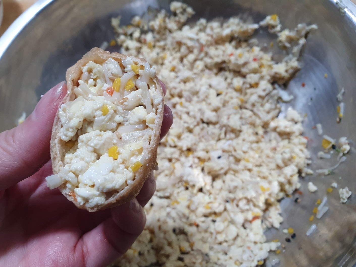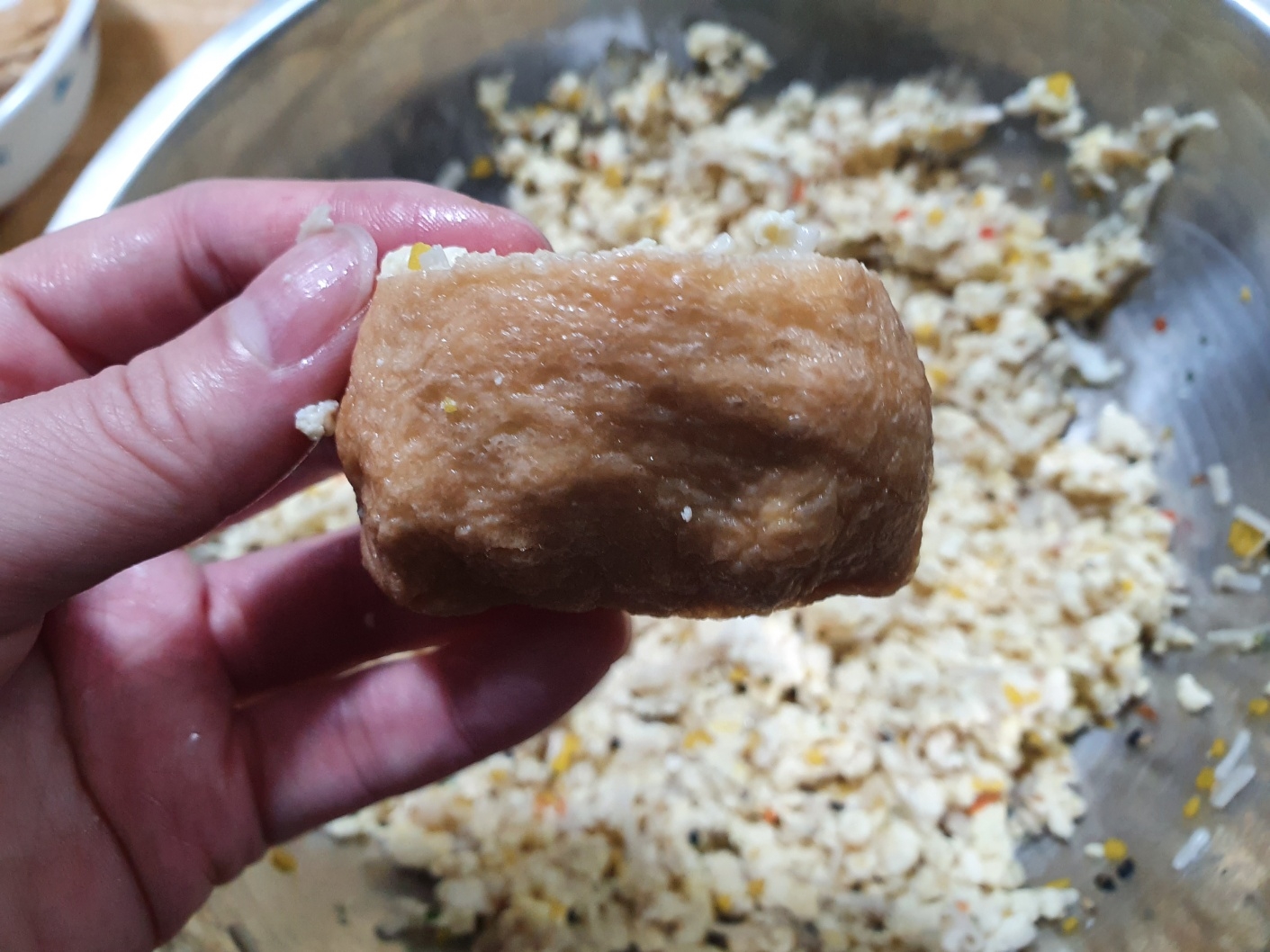 소스를 충분히 제거한 유부에 두부로 속을 꽉꽉 채워주면 끝이랍니다!!
