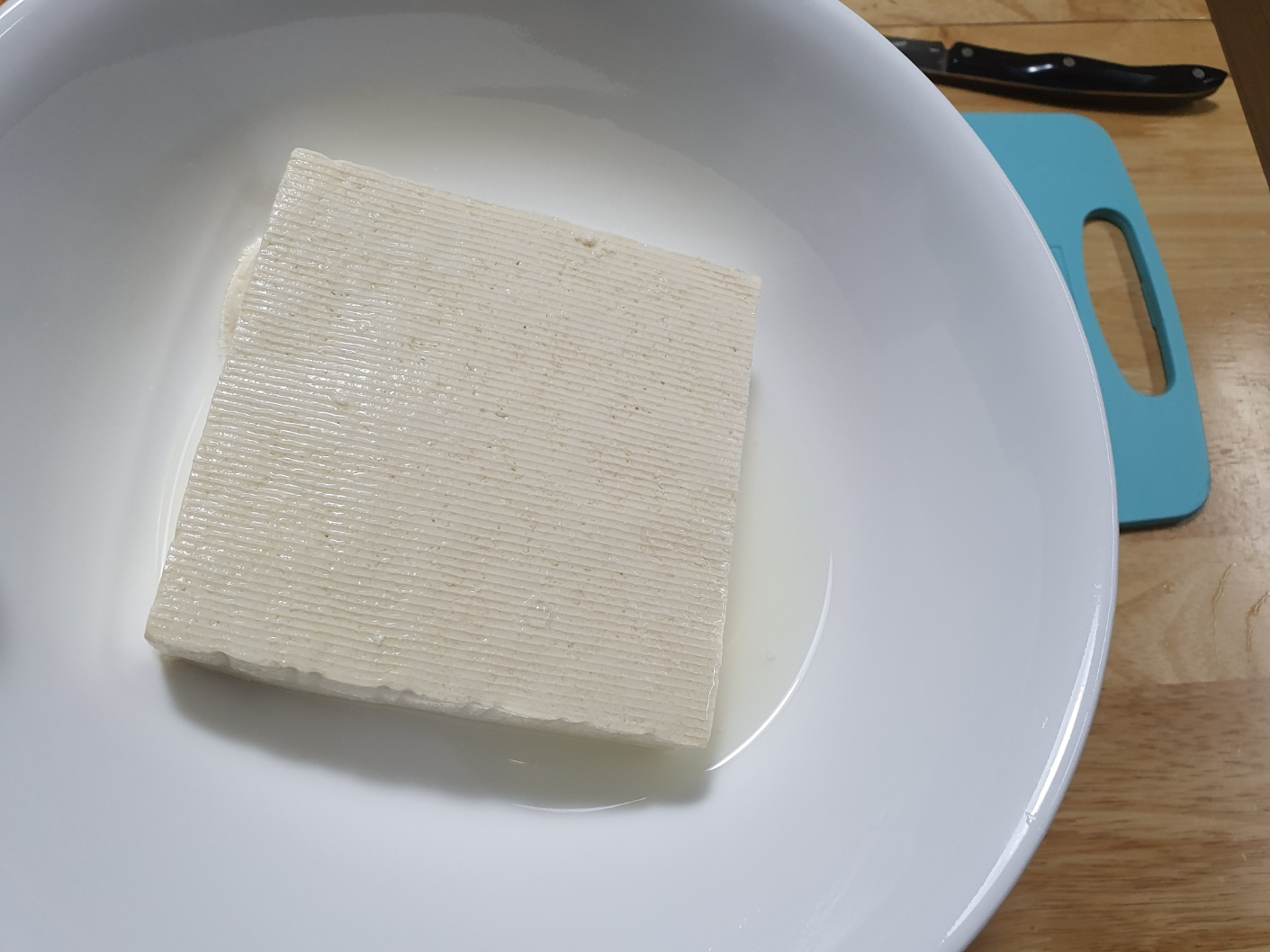 두부를 2분정도 전자레인지에 돌리면, 이정도 간수가 제거가 되는데요~ 후라이팬에 두부 볶아서 사용할 예정이라, 저정도만 간수제거가 적당한 것 같아요!!
