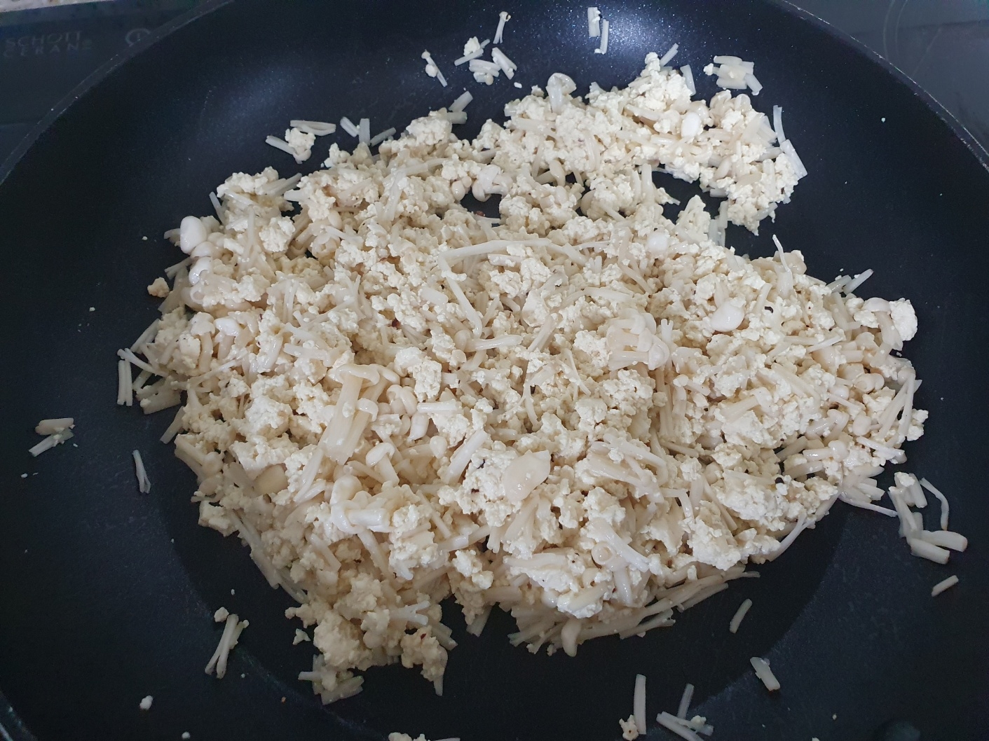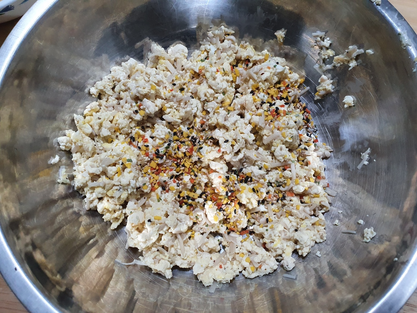 으깬 두부와 팽이버섯을 함께 넣어서 볶아주는데요~~ 이 작업은 물기를 조금 더 제거하고, 팽이버섯을 조리하기 위한 작업이예요! 볶는 동안에 소금과 후추를 약간 해서 간을 해줬어요!! 너무 싱거우면...맛이없기에..약간의 조미를 했답니다 :D